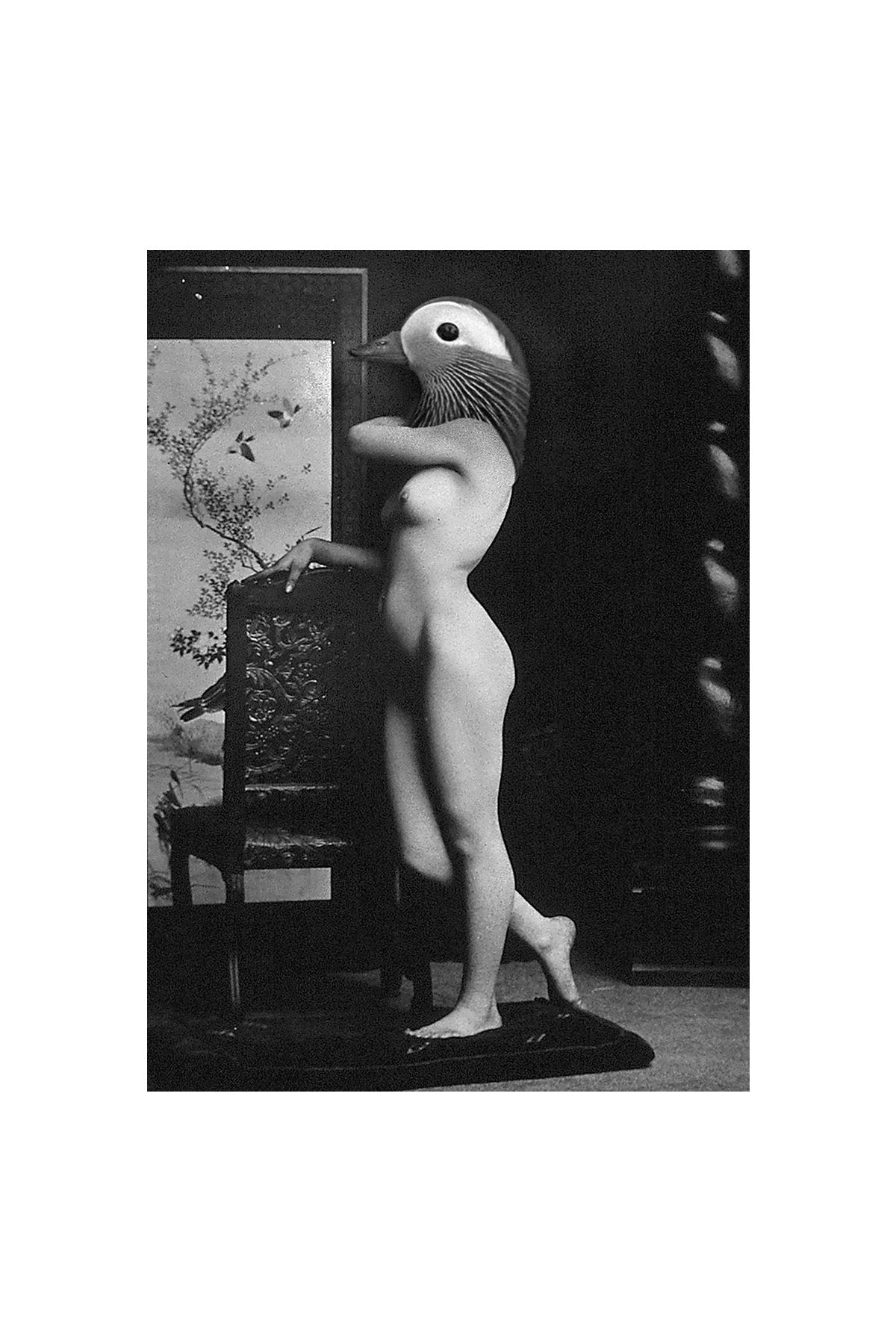 A real vintage nude digitally collaged with a duck head! DTF transfer on a 100% preshrunk cotton Gildan g500 unisex t-shirt.