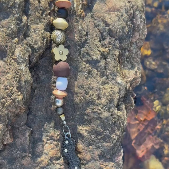 Stay sharp with this handy blade! A totem of thrifted beads coming in at a total of 8.5" long (when blade is concealed). A mix of silver metal, wood and natural stones.