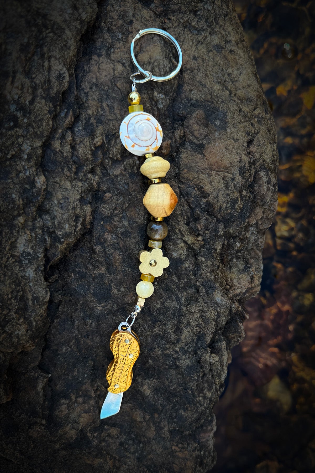 Stay sharp with this handy blade! A totem of thrifted beads coming in at a total of 7.2" long (when blade is concealed). A mix of silver metal, wood and natural stones.