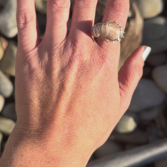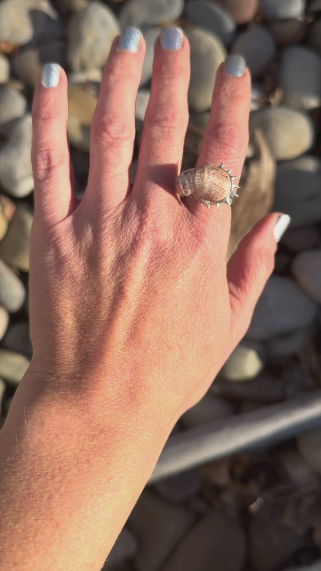 Fidget Spin Ring for Adults! Hand soldered seashell from the shoreline of Connecticut. Make a bold statement with this large cocktail ring and watch it rotate with your movements. Adjustable ring size starting at 8 and can be enlarged up to a size 11-12.