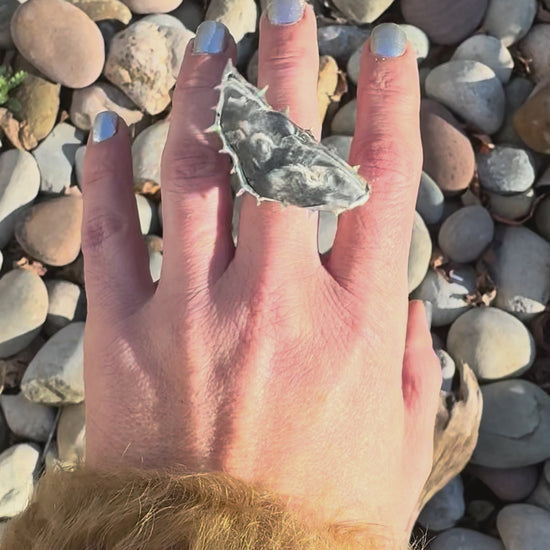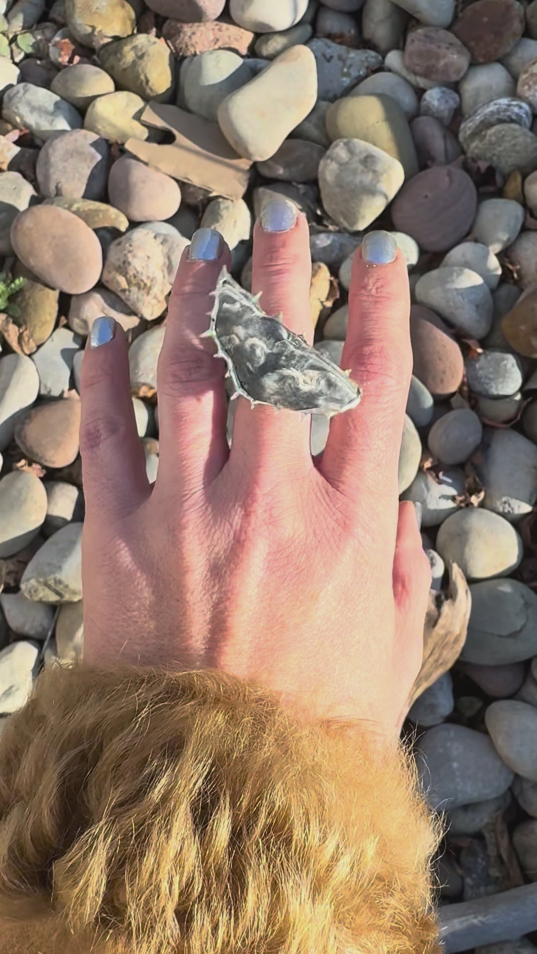 Fidget Spin Ring for Adults! Hand soldered seashell fragment from the shoreline of Connecticut. Make a bold statement with this large cocktail ring and watch it rotate with your movements. Adjustable ring size starting at 7 and can be enlarged up to a size 11-12.