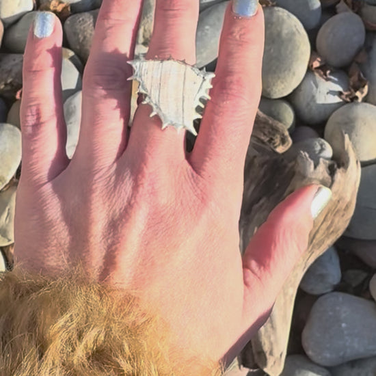 Fidget Spin Ring for Adults! Hand soldered seashell fragment from the shoreline of Connecticut. Make a bold statement with this large cocktail ring and watch it rotate with your movements. Adjustable ring size starting at 8 and can be enlarged up to a size 11-12.