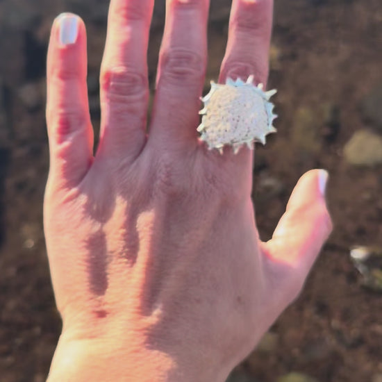 Fidget Spin Ring for Adults! Hand soldered seashell fragment from the shoreline of Connecticut. Make a bold statement with this large cocktail ring and watch it rotate with your movements. Adjustable ring size starting at 8 and can be enlarged up to a size 12.