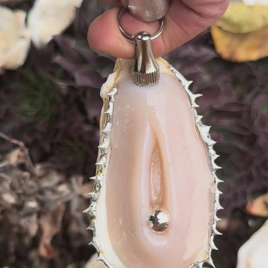 This bag charm is part of the Vicious Venus Collection consisting of beautiful pussies fashioned inside hand-picked seashells from the shores of Connecticut! Each vagina is uniquely formed with polymer clay around a hidden blade that opens and releases when the hardware is screwed from and into the pussy (*wink*). The *sharp* soldered edges of the shell mimic nature's defense mechanism against predators, but please be careful when handling personally!