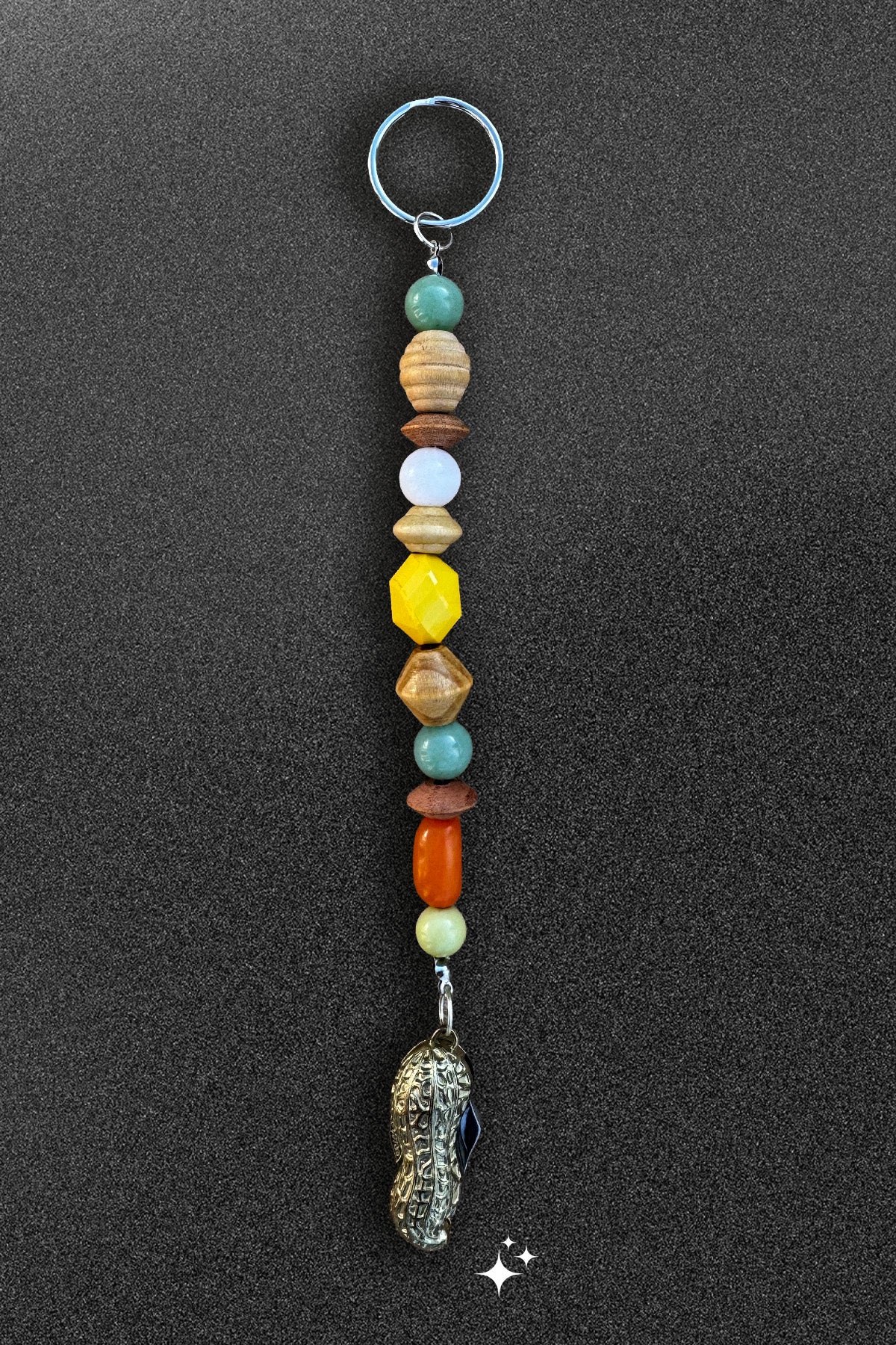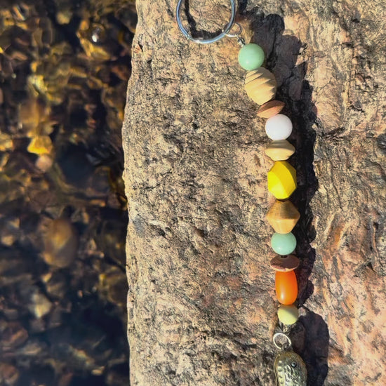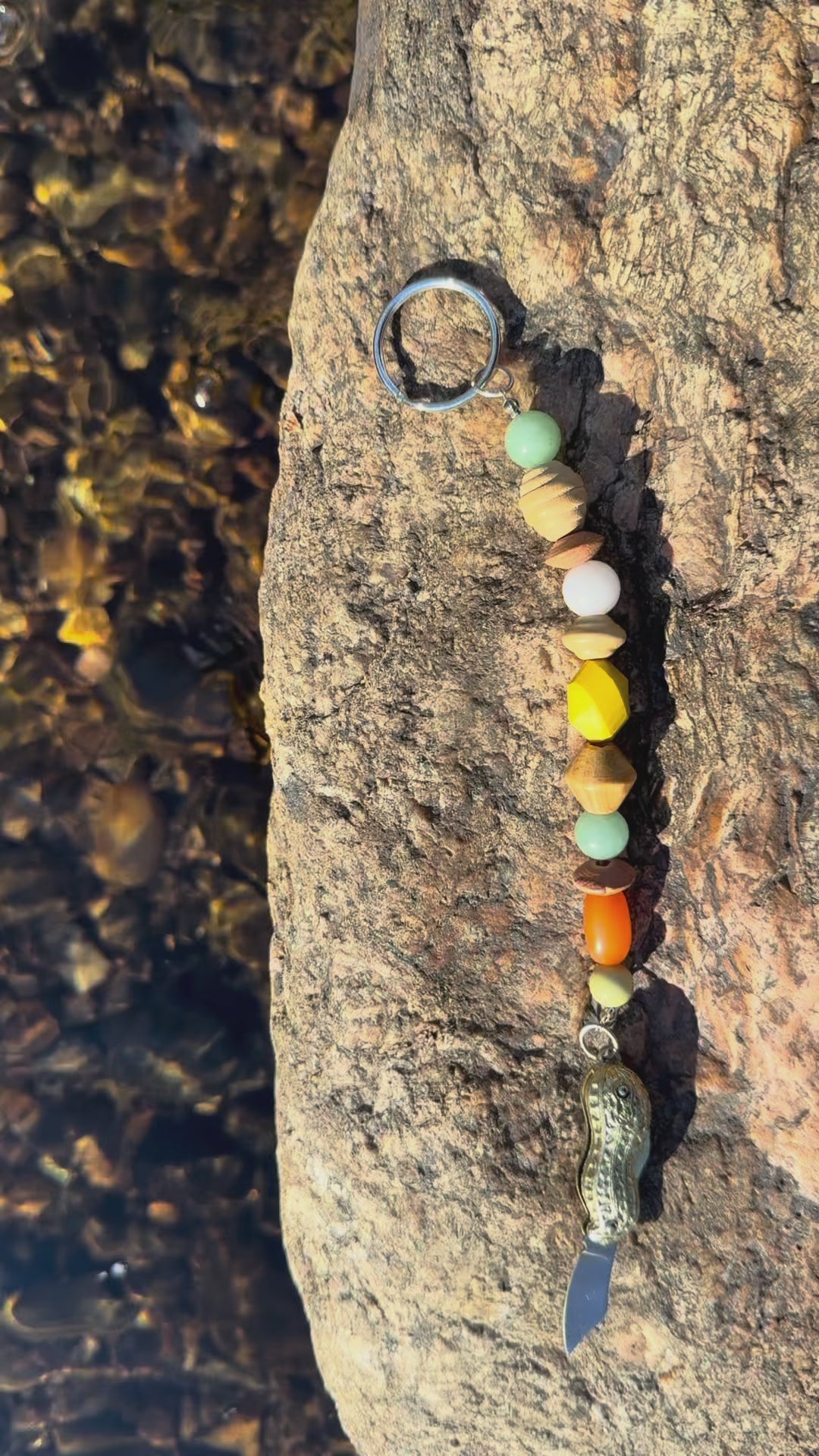 Stay sharp with this handy blade! Thrifted knife with button that releases blade, marked "Rich." A totem of reused beads coming in at a total of 9" long (when blade is concealed). A mix of silver metal, wood and natural stones.
